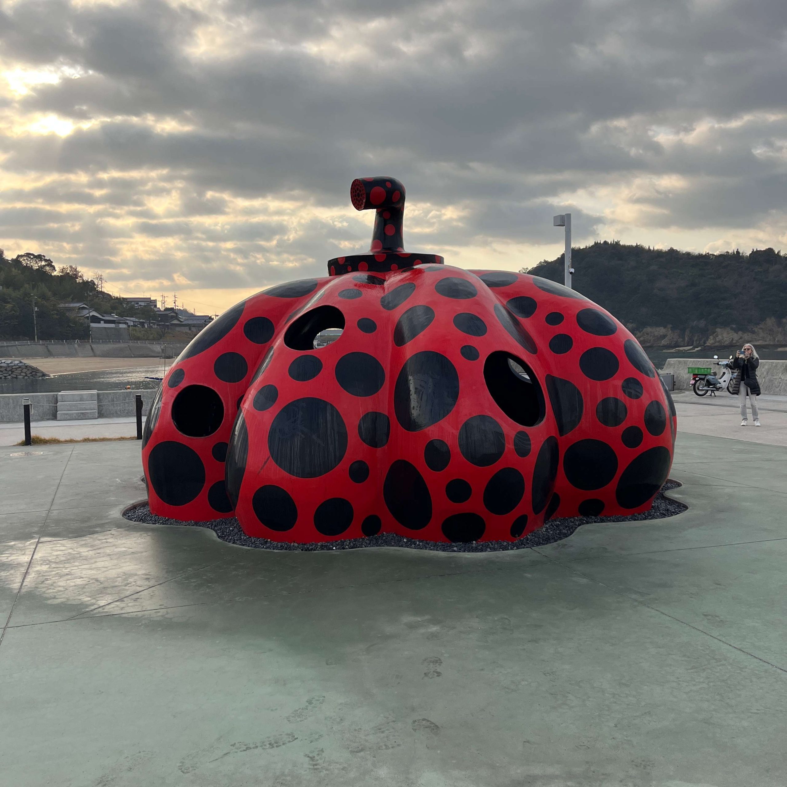宮浦港には草間彌生の赤いカボチャの